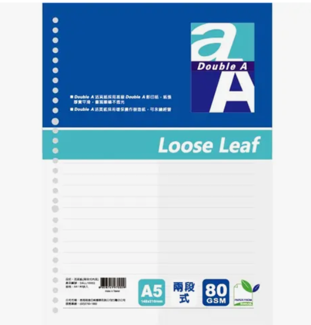 Double A A5/20孔活頁紙-兩段式 #DALL10002